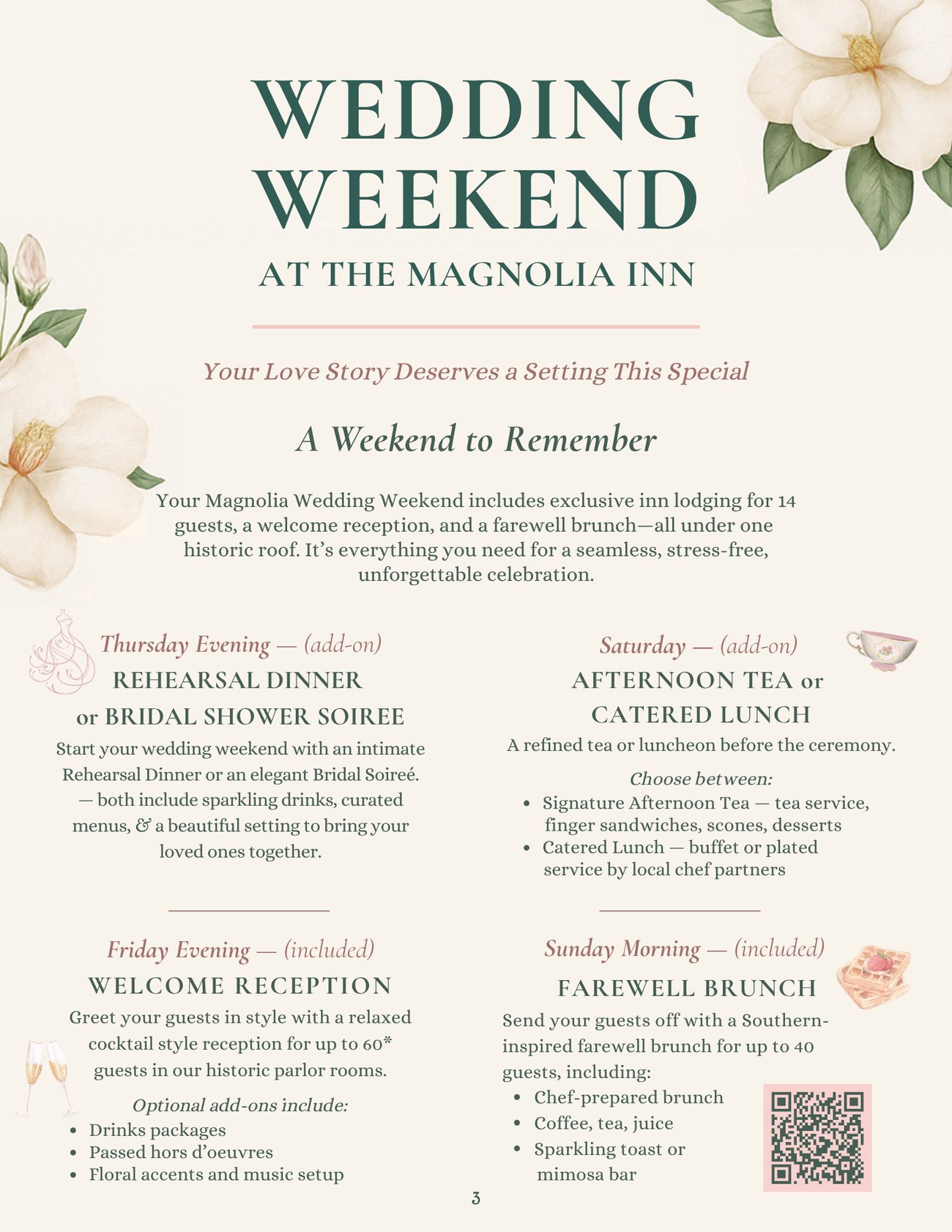 ✨ Finalized our wedding weekend packages with Signature and Deluxe options, each including full inn lodging and a welcome reception. |